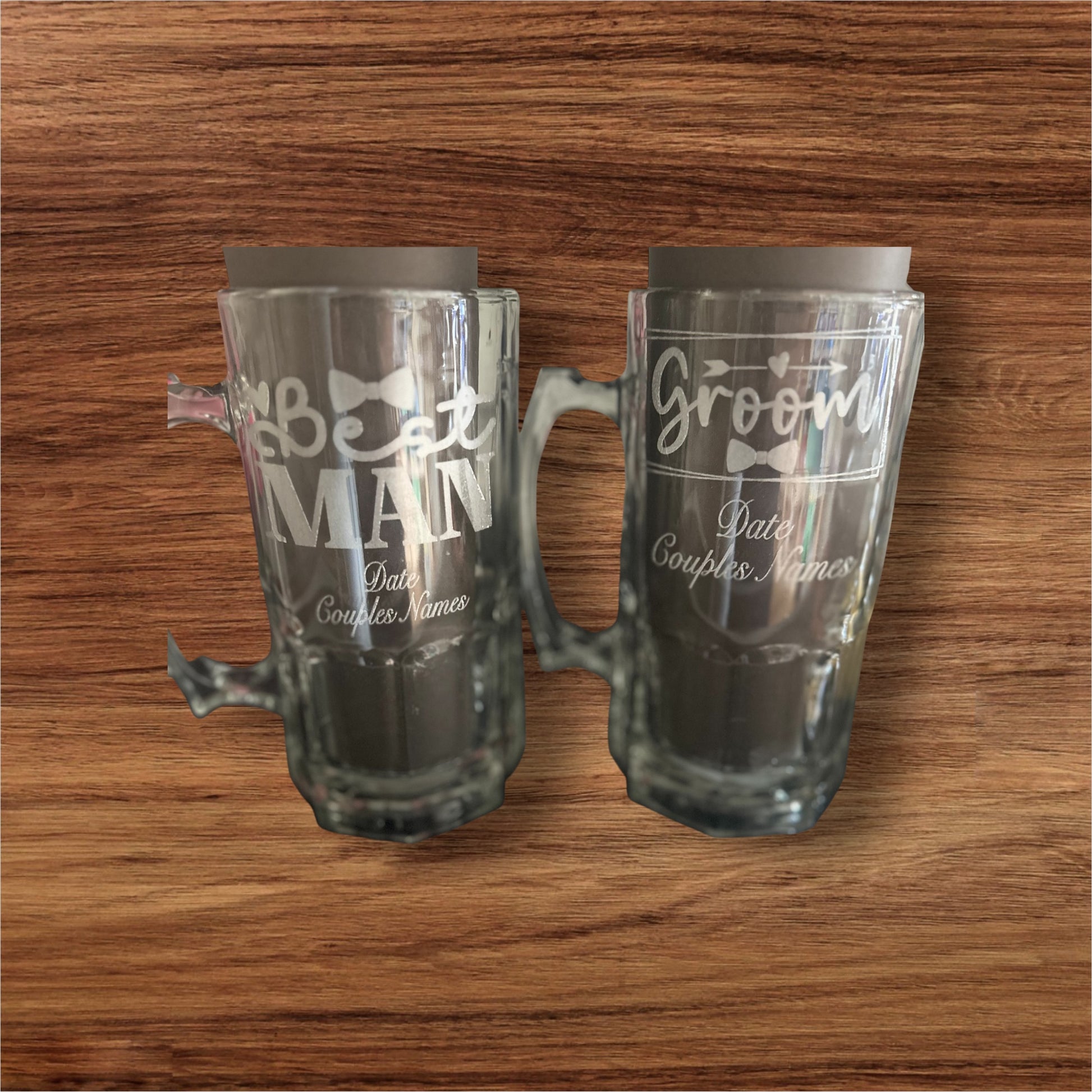 These beer mugs are custom, designs can be changed to suit your needs and liking. These are just samples that I done as a reference to the finished product you will receive. They can be used at the reception or maybe just get as gifts for the best man and groomsmen!