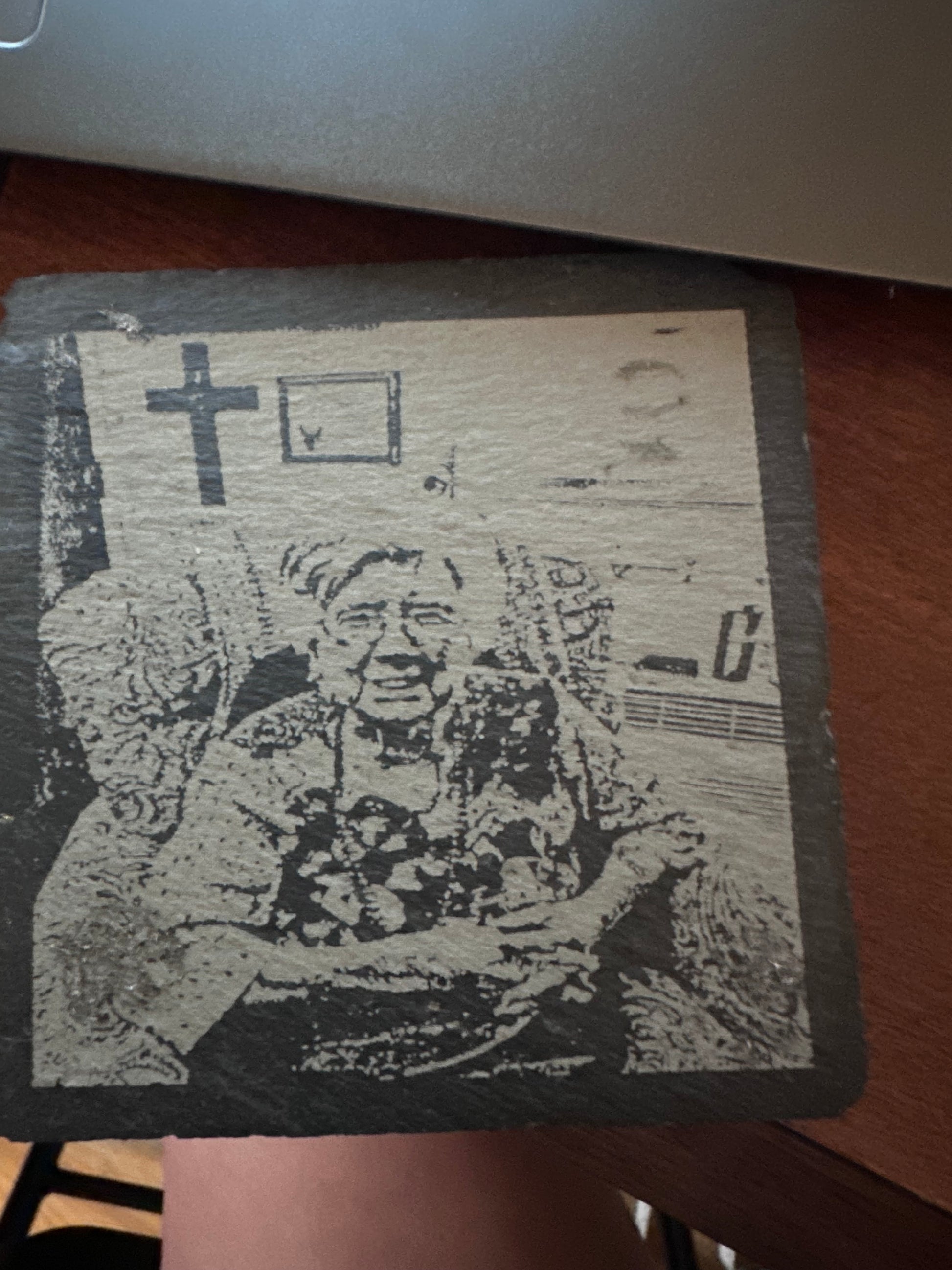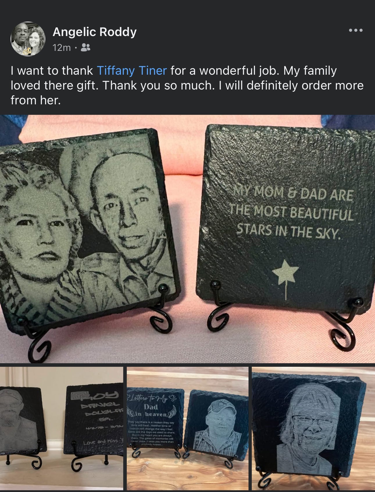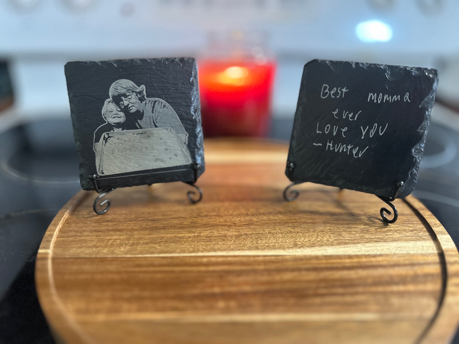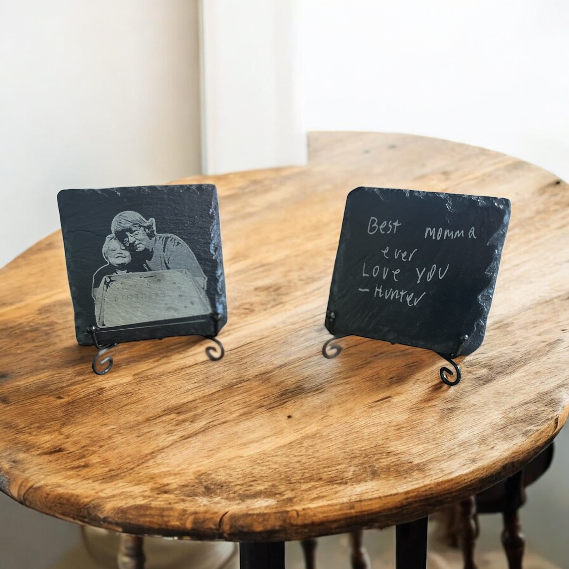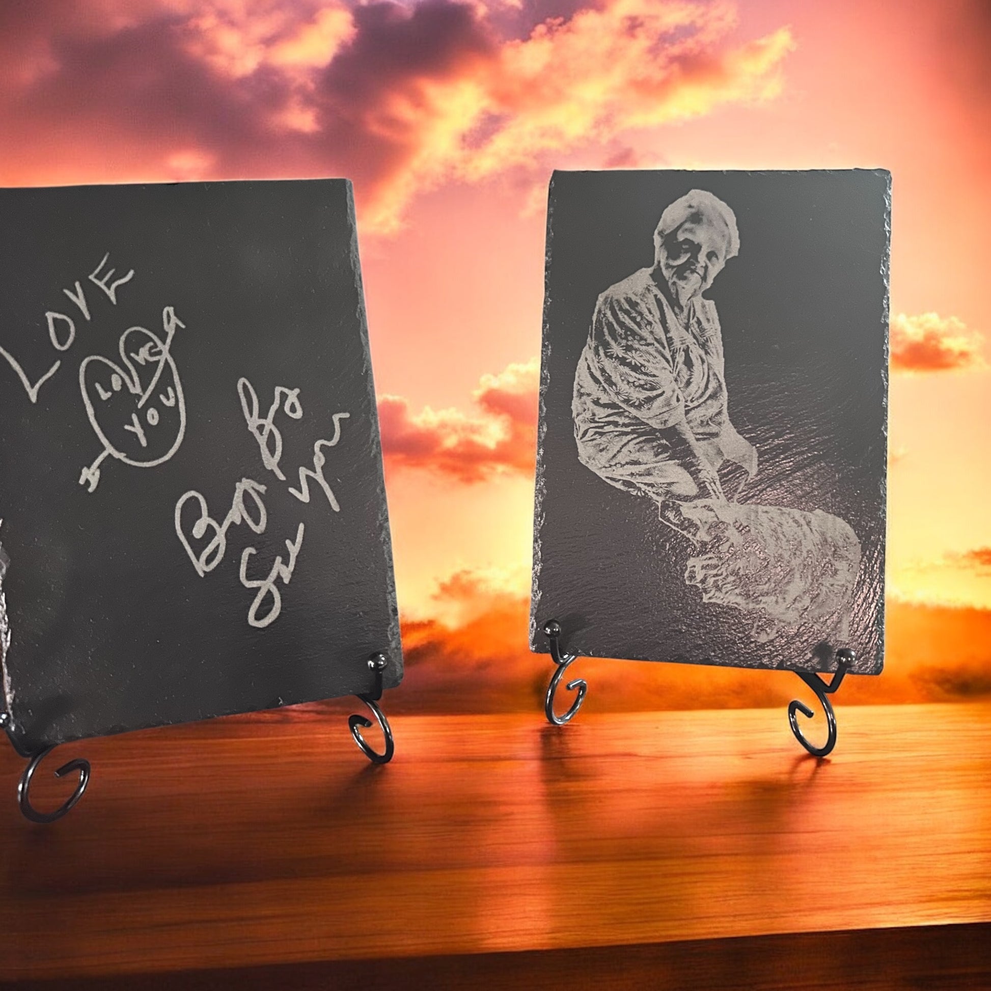 Put a special photo of a loved one onto slate to give as a gift or just to have to cherish. Slate sizes come in 4x4 inch, 8.8x6 inch, and 16x12 inch. Each piece comes with a stand. Even add handwriting to make it even more special.